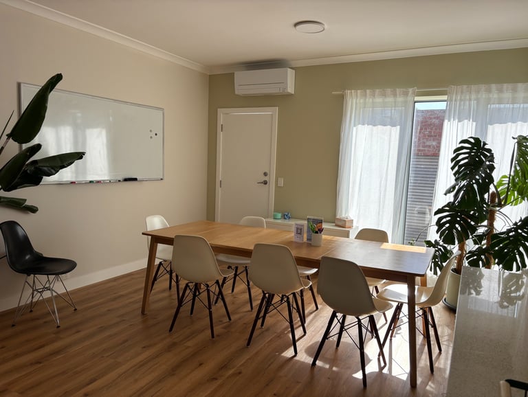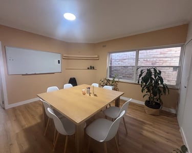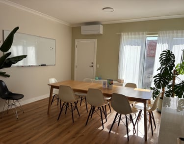 Weather permitting, classes or gatherings can also take place on our sunny terrace, adding a refreshing outdoor option to your learning experience. Toilets, a bathroom, and a fully accessible kitchen are available for everyone to use.